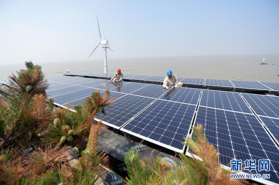 在江苏省灌云县开山岛,国家电网的施工人员在屋顶上检查光伏面板运行情况(2019年6月18日摄)。新华社发(万程鹏 摄)