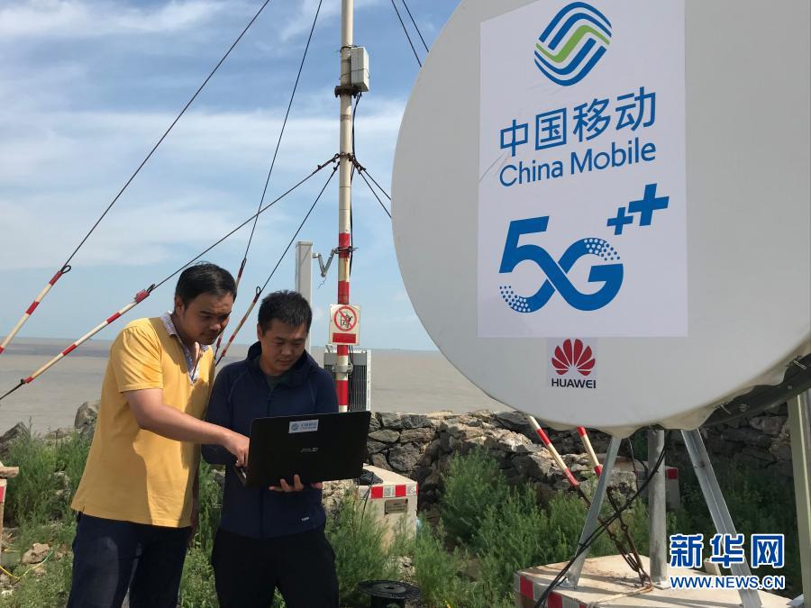 在江苏省灌云县开山岛,中国移动工作人员测试5G信号(5月20日摄)。新华社发(茆平平 摄)