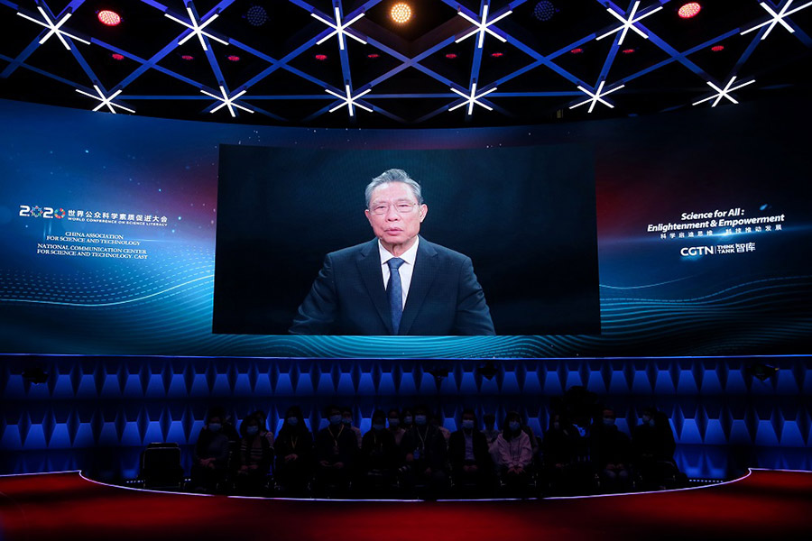 12月8日,由中国科学技术协会和中国中央广播电视总台CGTN共同举办的“科学素质与全球挑战”电视专题论坛在京举行。中宣部副部长、中央广播电视总台台长兼总编辑慎海雄,中国科学技术协会党组书记、常务副主席、书记处第一书记、中国科学院院士怀进鹏,“共和国勋章”获得者、中国工程院院士钟南山出席论坛并致辞。