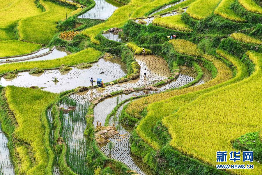 贵州省从江县加榜乡党扭村的农民在收割水稻(9月19日摄)。