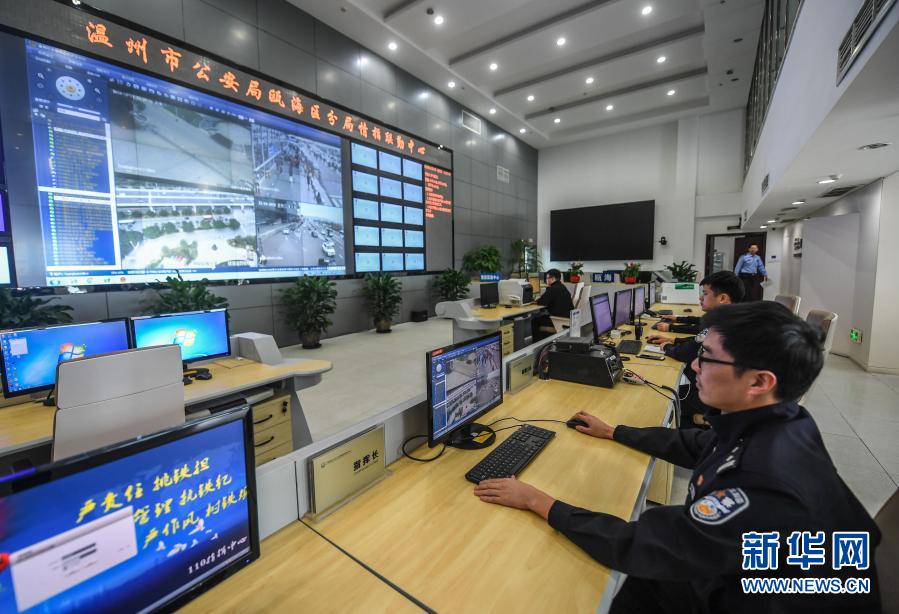 浙江省温州市瓯海区公安分局指挥中心内,警务人员在后台实时监控各类动态信息(2018年11月14日摄)。该局依托互联网大数据等新手段,打造管理新模式,全面提升了警务效能。新华社记者 徐昱 摄