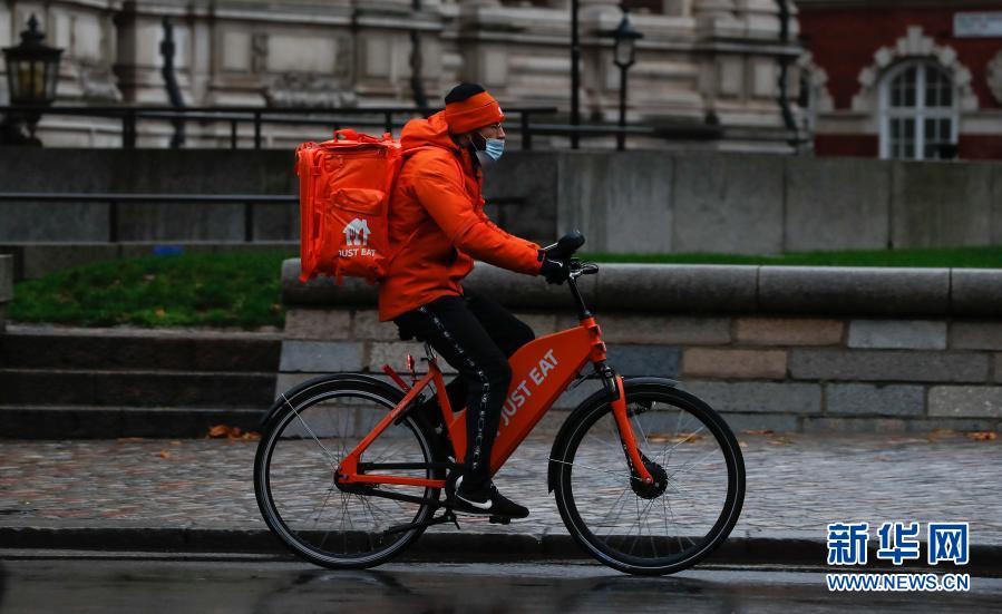 12月13日,戴口罩的送餐员在英国伦敦市中心骑行。 新华社记者韩岩摄