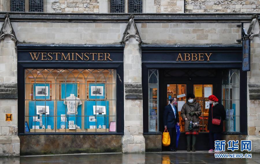 12月13日,戴着口罩的人们在英国伦敦威斯敏斯特教堂前的商店避雨。 新华社记者韩岩摄