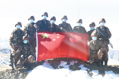 “里孜戍边模范连”官兵巡逻到达界碑前,向国旗宣誓并合影留念。 邬 军摄