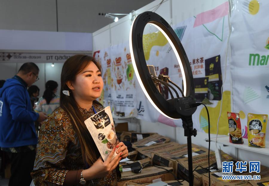 参展商在第17届中国—东盟博览会上通过网络直播推销商品(11月27日摄)。