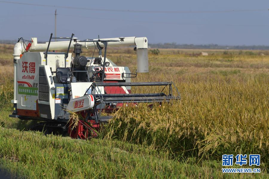 无人收割机在江西省南昌县蒋巷镇大田农社智慧农场演示水稻收割(11月14日摄)。