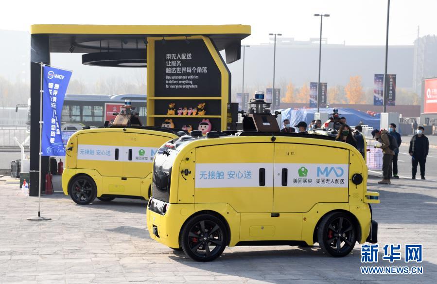 这是2020世界智能网联汽车大会室外展区展出的无人配送车(11月12日摄)。