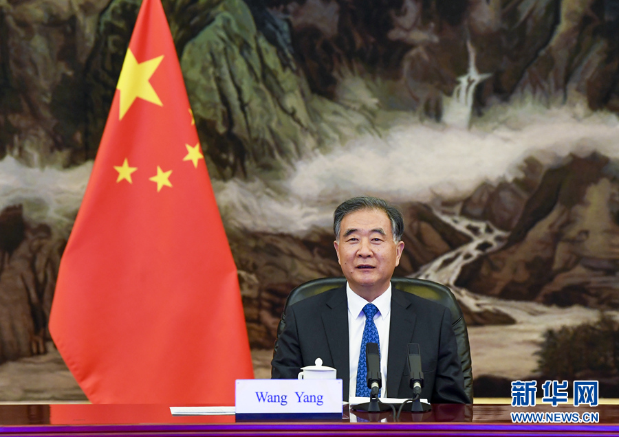 12月16日,全国政协主席汪洋在北京以视频方式会见巴基斯坦参议院主席桑吉拉尼。新华社记者 高洁 摄