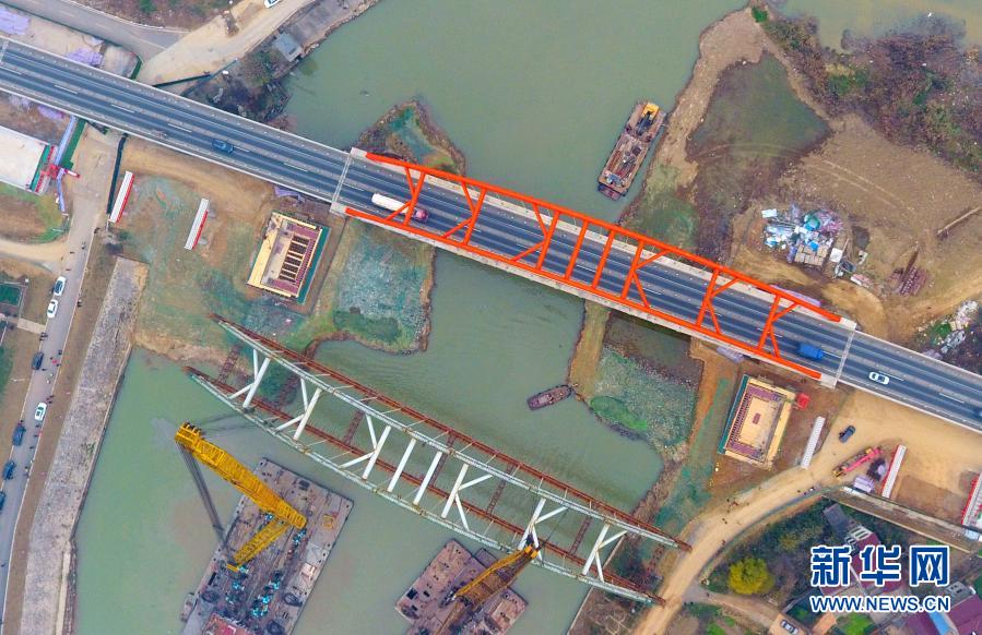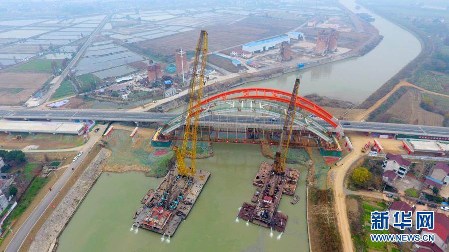12月18日,中铁二十局集团工人在江苏常州吊装河定大桥(无人机照片)。新华社发(朱国贤 摄)