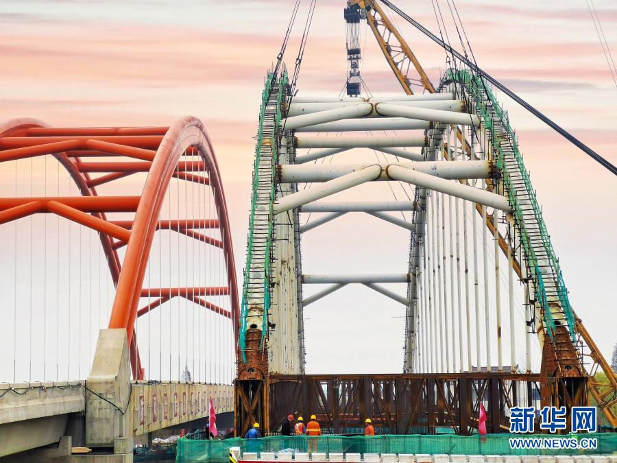 12月18日,中铁二十局集团工人在江苏常州吊装河定大桥。新华社发(杨青妹 摄)