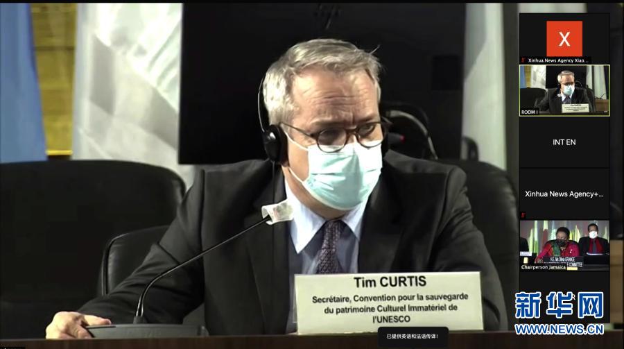 这张12月18日的视频截图显示的是,联合国教科文组织《保护非物质文化遗产公约》秘书蒂姆·柯蒂斯在法国巴黎参加线上视频会议。新华社发