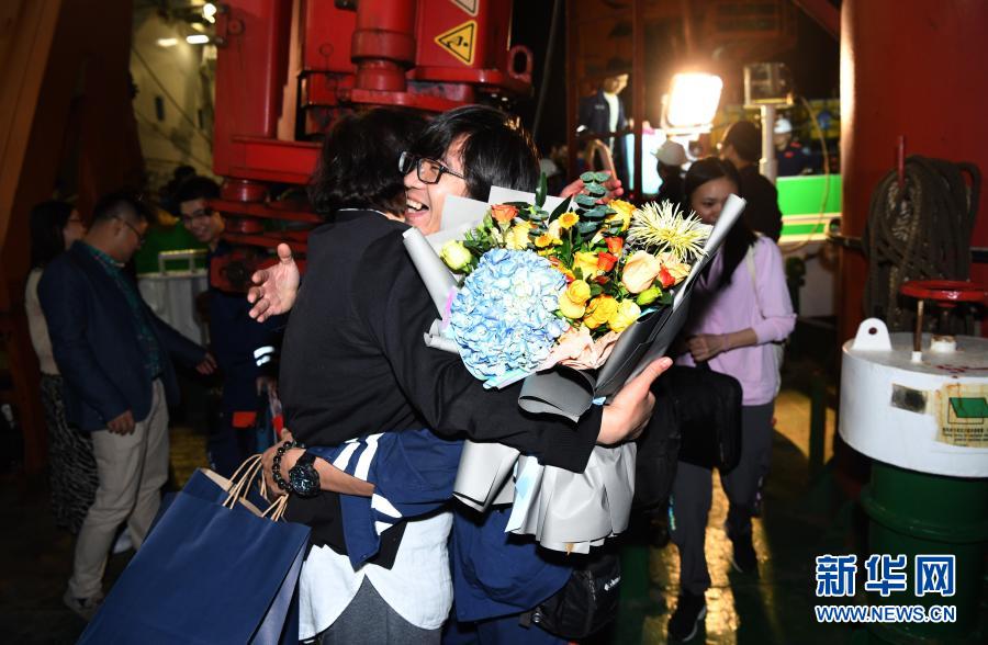 12月21日,“奋斗者”号海试保障母船“探索二号”靠泊三亚,欢迎人员给科考队员献花。