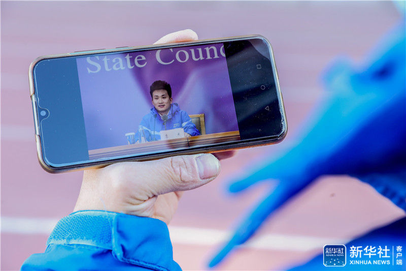 12月16日,李杰在展示他在参加国务院联防联控机制新闻发布会时的照片。新华社记者 张玉薇 摄