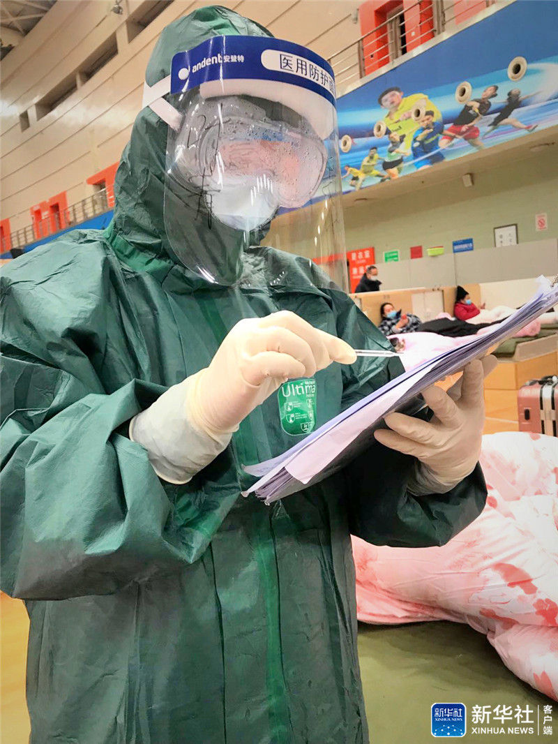 ↑国家紧急医学救援队(贵州)队员叶青在武汉体育中心方舱医院内工作(资料照片)。新华社发
