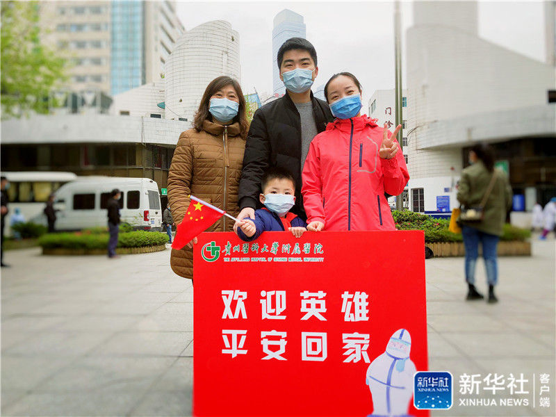 ↑贵州医科大学附属医院护士叶青(右一)结束武汉抗疫工作后回到贵阳和家人合影留念(资料照片)。新华社发