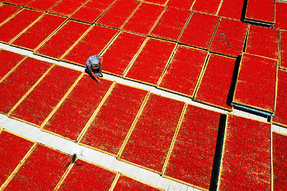 2020年7月19日,甘肃省张掖市高台县黑泉镇十坝村,当地农民正在戈壁滩上晾晒成熟的枸杞。郑耀德 摄