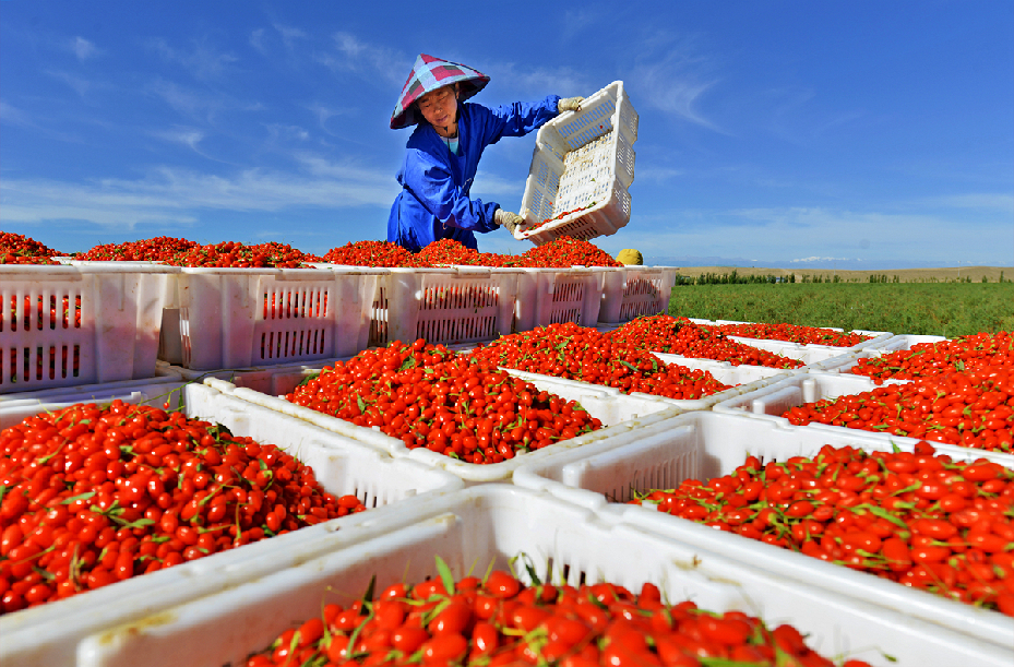 2020年7月19日,在甘肃省张掖市高台县黑泉镇十坝村戈壁滩上,农民正在将采摘成框的枸杞装车。郑耀德 摄