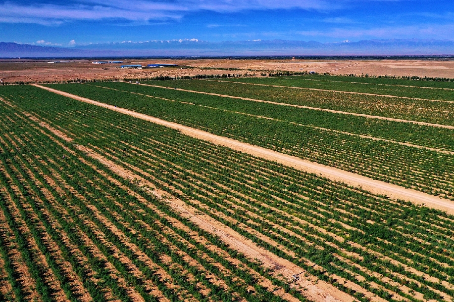 2020年7月19日,在甘肃省张掖市高台县黑泉镇十坝村戈壁滩上,一眼望不到边的枸杞种植基地,在祁连雪山的映衬下显得蔚为壮观。郑耀德 摄