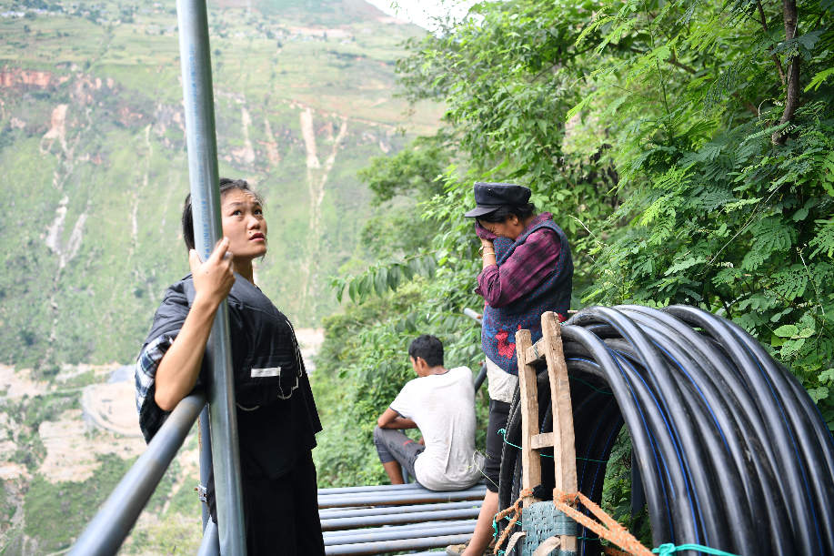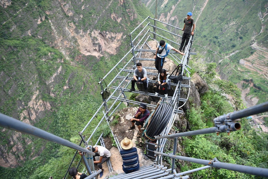 2017年9月初,四川凉山“悬崖村”村民背货物通过天梯上山,中途休息。四川省凉山州昭觉县支尔莫乡阿土列尔村,坐落于海拔约1600米的山坳中,从山底到山顶村庄海拔高差近1000米,村民往返村子都需要借助悬崖峭壁间的天梯,从而被称为“悬崖村”。为缓解村民出行险的问题,当地投入120吨钢材、共6000根钢管修筑了2556级“钢管天梯”,工程于2017年6月底彻底完工,如今,“钢管天梯”已经取代了之前更危险的藤梯,成为村民通往外界唯一的道路。 张浪摄