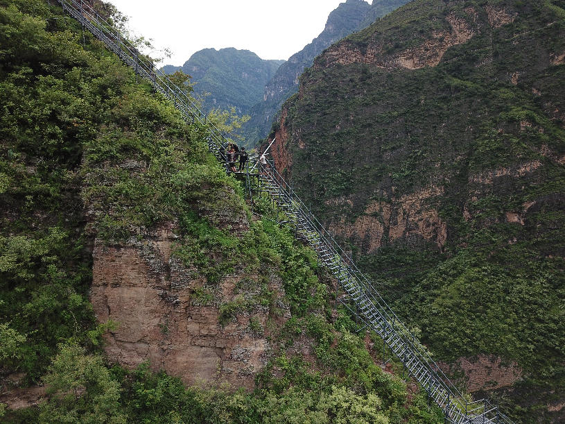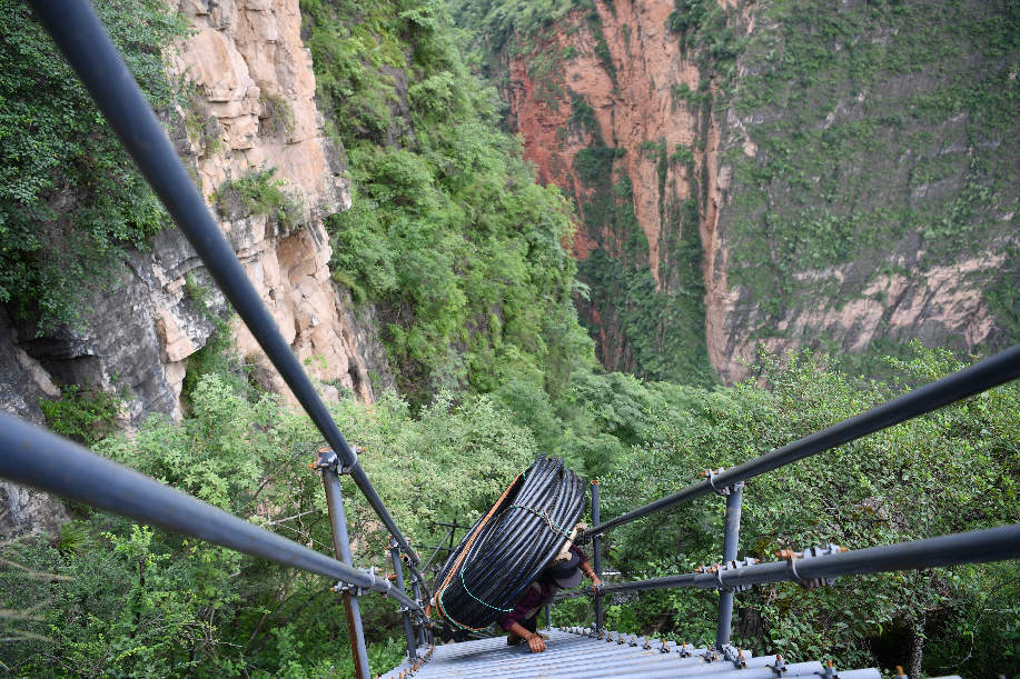2017年9月初,四川凉山“悬崖村”村民背货物通过天梯上山。四川省凉山州昭觉县支尔莫乡阿土列尔村,坐落于海拔约1600米的山坳中,从山底到山顶村庄海拔高差近1000米,村民往返村子都需要借助悬崖峭壁间的天梯,从而被称为“悬崖村”。为缓解村民出行险的问题,当地投入120吨钢材、共6000根钢管修筑了2556级“钢管天梯”,工程于2017年6月底彻底完工,如今,“钢管天梯”已经取代了之前更危险的藤梯,成为村民通往外界唯一的道路。 张浪 摄