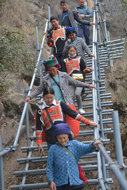 2020年5月13日,四川省凉山州昭觉县支尔莫乡阿土列尔村31户村民带着行李通过钢梯下山,集中搬迁至昭觉县易地扶贫搬迁县城集中安置点的新家。阿土列尔村因位于垂直落差上千米的陡峭悬崖上,曾经村民上下山都要在岩壁上攀爬,从而被称为“悬崖村”。5月14日前,全村84户建档立卡贫困户将陆续搬进县城新家。张浪 摄