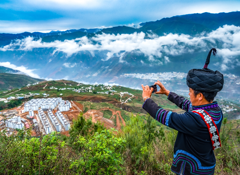 四川凉山彝族自治州金阳县马依足镇“千户彝寨”东山易地移民社区,占地300余亩,2020年8月完工,已完成安置易地搬迁户1600多户。图为易地搬迁居民在看望即将搬入的新居时,用手机记录下美丽的新家园。 杨黎明 摄