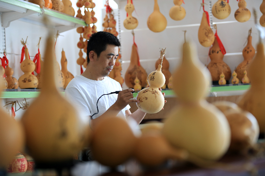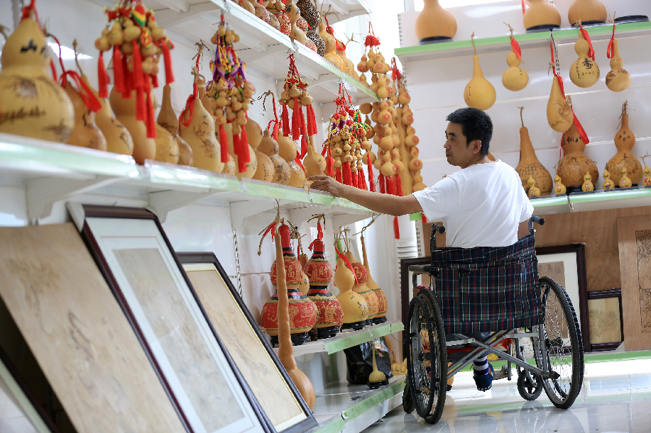 河北省邢台市平乡县霍建龙,2014年因一起意外事故导致高位截瘫。身残志坚的他学习烙画葫芦艺术,实现脱贫致富,并创办了残疾人烙画葫芦社,带领其他残疾贫困群众脱贫致富。图为霍建龙整理葫芦作品。 柴更利 摄