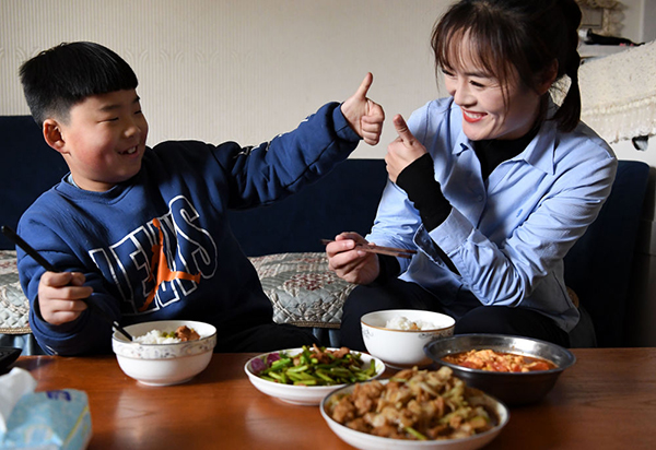 12月18日,黄菲8岁的儿子宋晗昱和妈妈一起吃午饭,并为妈妈做的饭菜点赞。