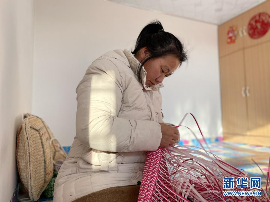 12月20日,在黑龙江省大庆市林甸县宏伟乡宏伟村,脱贫户马长兰在家中编织篮子。新华社记者 杨喆 摄