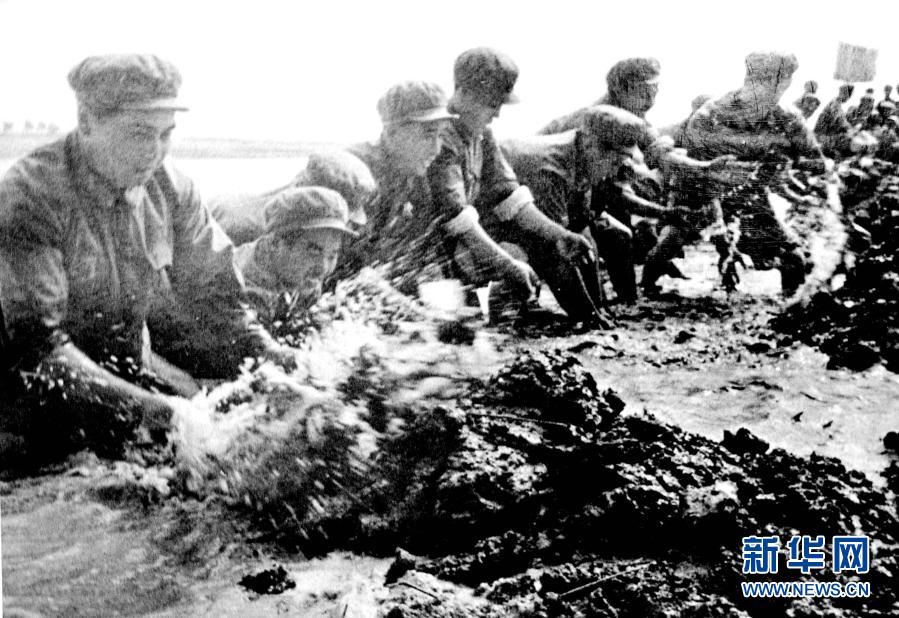 西昌卫星发射中心西昌发射场建设初期,老一辈航天人在安宁河中抢建长征桥(资料图片)。新华社发