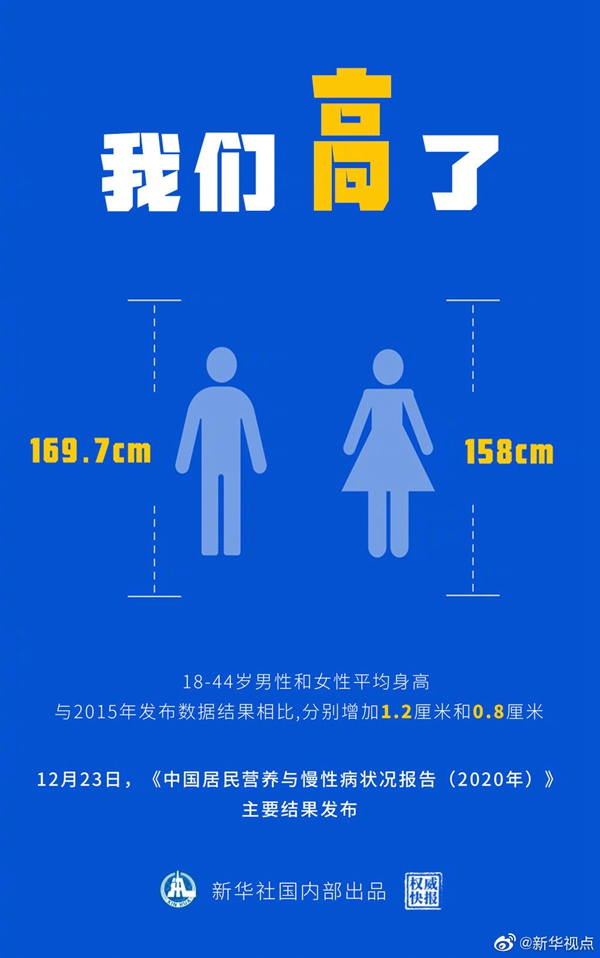 你的营养和健康情况怎样?高了?身体倍棒?12月23日,一份关乎你我的健康大数据重磅上新,《中国居民营养与慢性病状况报告(2020年)》主要结果发布——成人平均身高继续增长,营养不足问题得到改善,健康意识逐步增强。(记者:陈聪,海报设计:张晨光)