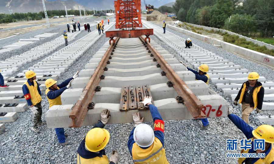 在川藏铁路拉萨至林芝段,工人进行铺轨作业(2019年9月2日摄)。新华社记者 觉果 摄