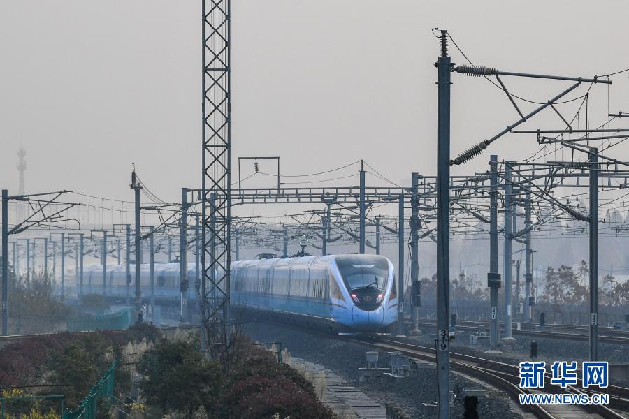 12月24日,由CR300BF型“复兴号”动车组担当的C3887次列车驶出南京南站。新华社记者 李博 摄