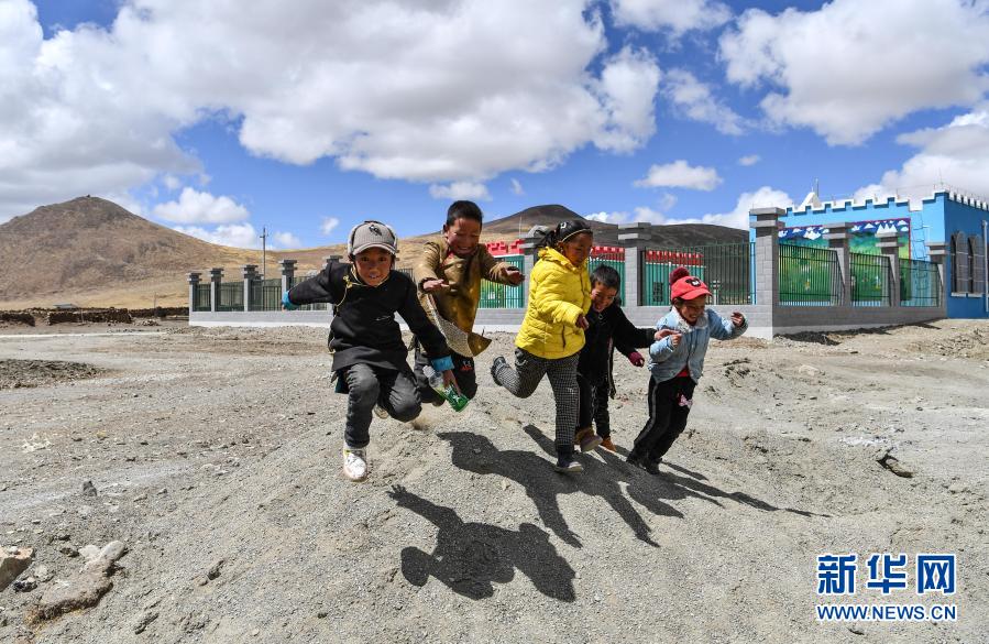 在我国海拔最高的行政乡——西藏山南市浪卡子县普玛江塘乡,小朋友们在新建成的幼儿园前玩耍(4月16日摄)。新华社记者 晋美多吉 摄