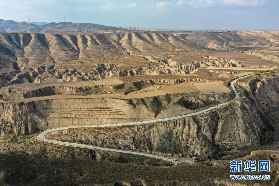 一条硬化路从山沟里延伸到旱塬上的贺家塬村村口(10月28日摄,无人机照片)。 新华社记者 王鹏 摄
