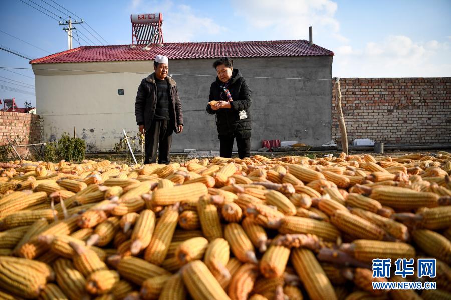 丁海燕(右)走访建档立卡户杨有全家,了解他今年玉米的收成情况(10月28日摄)。 新华社记者 杨植森 摄