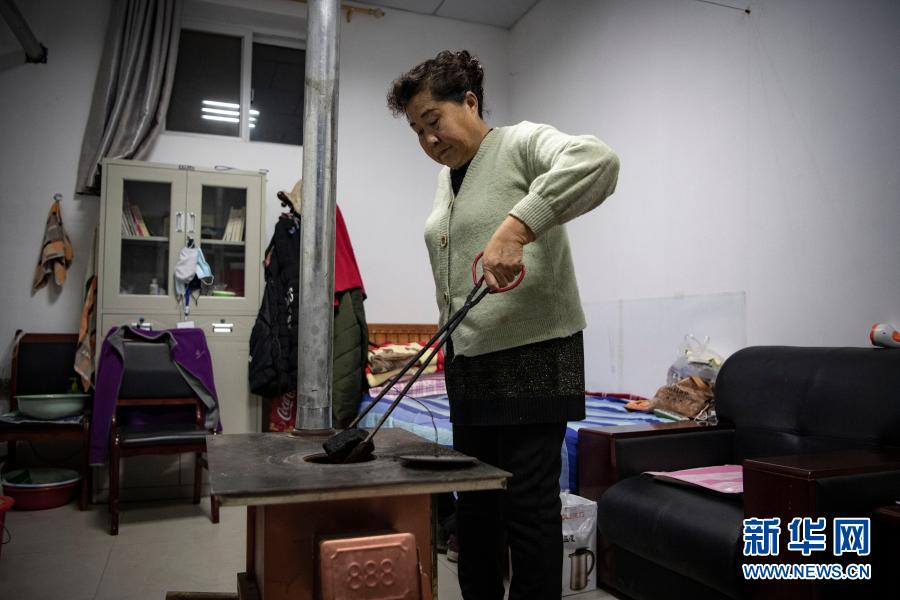 丁海燕办公、生活都在村部,这是她在为火炉加炭(10月28日摄)。 新华社记者 杨植森 摄