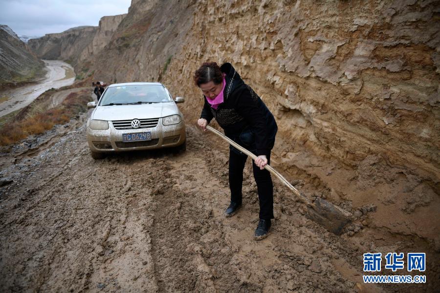 在通往贺家塬村的路上,因为降雪,路面泥泞、湿滑,车辆无法上坡,丁海燕在帮助司机铲平道路(2016年10月27日摄)。 新华社记者 王鹏 摄