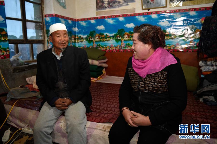 丁海燕(右)走村入户,在贫困户家中了解近况(2016年10月27日摄)。 新华社记者 王鹏 摄