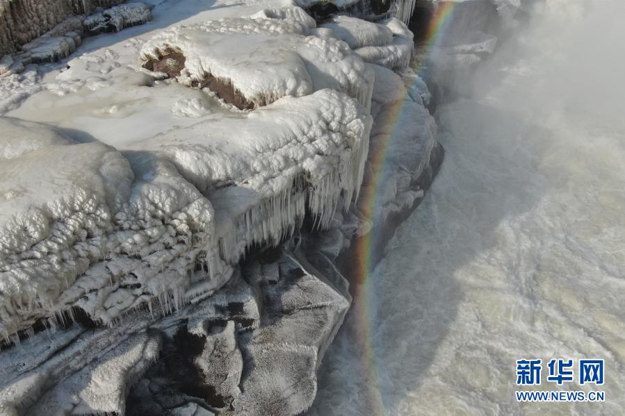 在无人机遥控器显示屏中鸟瞰黄河,从壶口瀑布到约60公里开外的龙门水文站之间,冰封河段犹如一条舞动的银色巨龙,流凌河段则好似盛开着一朵朵的冰莲花。壶口瀑布不再像夏天般那么奔腾咆哮,两岸处处是冰挂,瀑布上下游已经封冻。