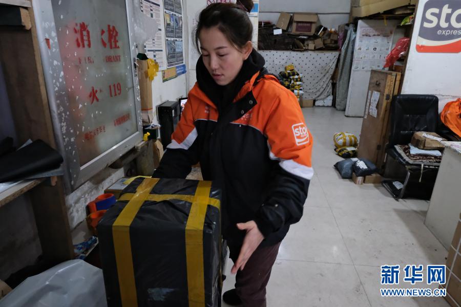 在黑龙江省漠河市,快递员吕慧在搬运快递包裹(12月29日摄)。新华社记者 黄腾 摄