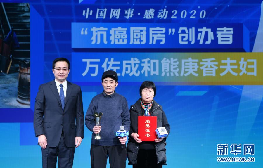 “中国网事·感动2020”十大年度网络人物有:“抗癌厨房”创办者万佐成和熊庚香夫妇、开“火龙”狂奔突围的硬汉孙刚、“草莓书记”刘海川、“关键技术突破者”刘寿长、“红土高原一枝梅”张桂梅、“抗疫硬汉”李俊岭、“带着家人去扶贫”毛鑫、武汉全能抗疫志愿者华雨辰、进藏追逐“高原梦”“90后”大学生张海鑫、抗疫英雄之医护群体。