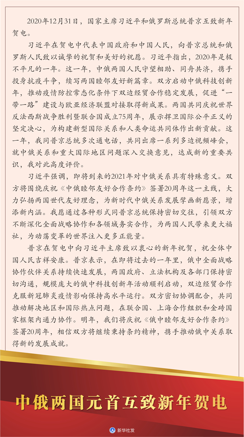 习近平强调,即将到来的2021年对中俄关系具有特殊意义。双方将围绕庆祝《中俄睦邻友好合作条约》签署20周年这一主线,大力弘扬两国世代友好理念,为新时代中俄关系发展擘画新愿景,增添新内涵。我愿通过各种形式同普京总统保持密切交往,引领双方不断深化全面战略协作和各领域务实合作,为两国人民带来更大福祉,为动荡变革的世界注入更多正能量。