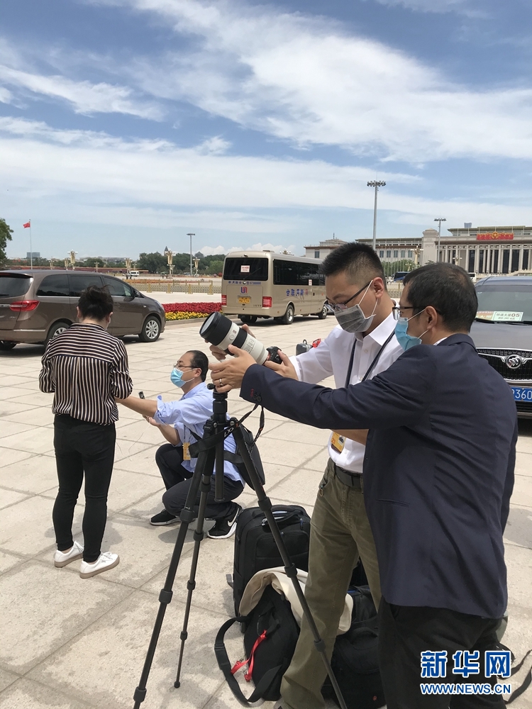 5月20日,全国政协十三届三次会议召开新闻发布会。大会新闻发言人郭卫民向中外媒体介绍本次大会有关情况并回答记者提问。图为本网记者在人民大会堂东门外广场做直播前准备工作。新华网记者 周红军 摄