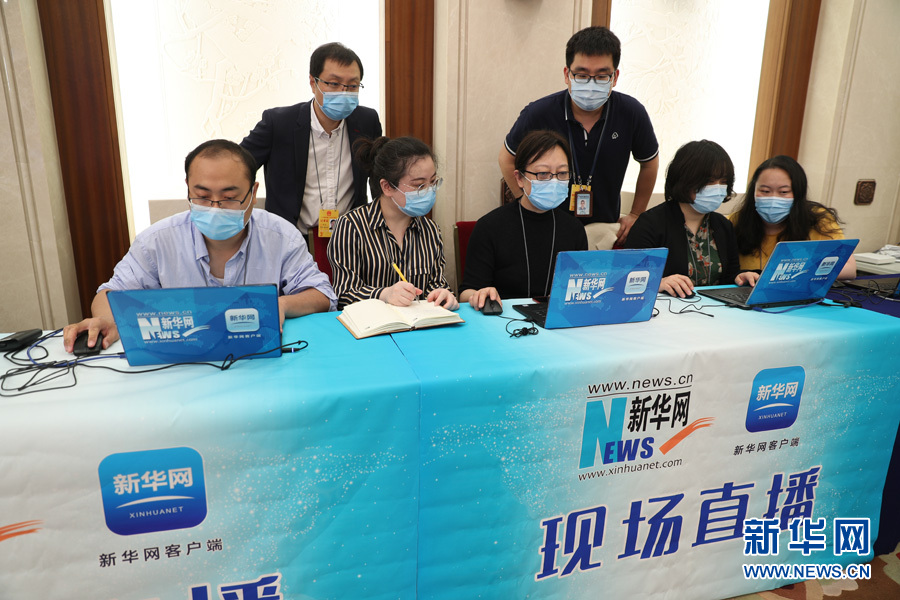 5月20日,全国政协十三届三次会议召开新闻发布会。大会新闻发言人郭卫民向中外媒体介绍本次大会有关情况并回答记者提问。图为本网记者在新闻发布会现场做直播准备工作。新华网记者 王翰林 摄