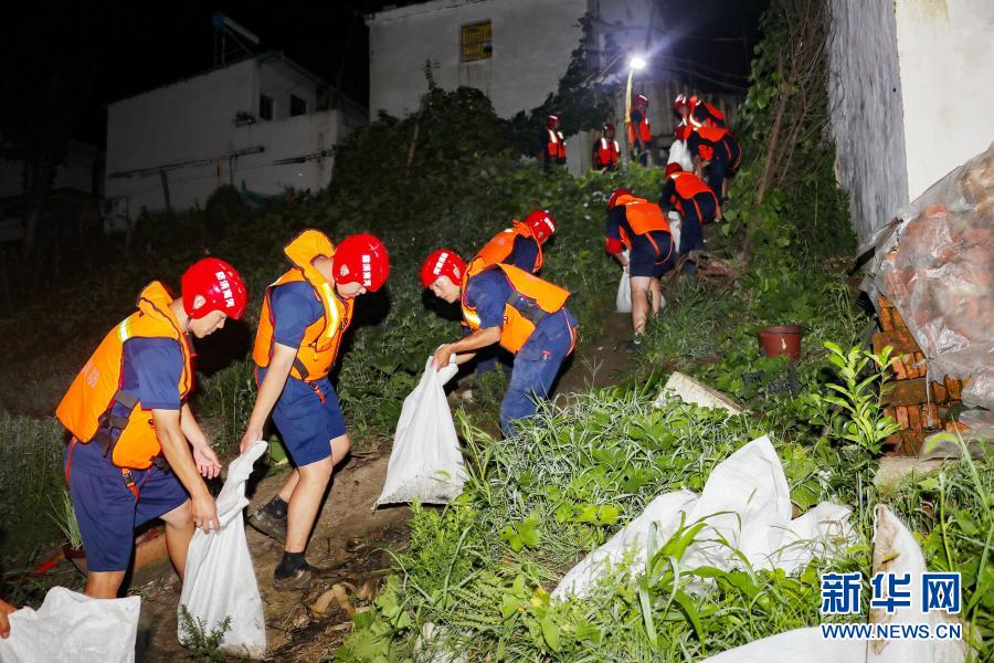 驰援安徽省阜南县抗洪的洛阳消防支队抗洪抢险突击队队员在郜台乡毕台村保庄圩搬运物资封堵管涌(2020年7月20日摄)。新华社发(郭抗抗 摄)