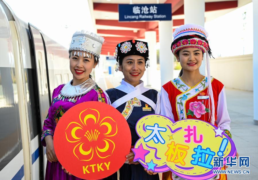 12月30日,乘务人员身穿少数民族服饰在铁路临沧站持标语合影。新华社记者 王冠森 摄
