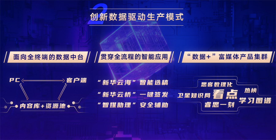 再造升级后的新华网突出“技术引领”,以“数据”为核心生产要素,为内容制作、聚合分发、用户运营等提供全流程支撑,实现生产模式“由外而内”的变革。