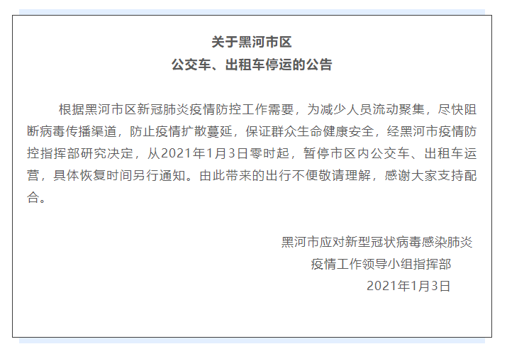 根据黑河市区新冠肺炎疫情防控工作需要,为减少人员流动聚集,尽快阻断病毒传播渠道,防止疫情扩散蔓延,保证群众生命健康安全,经黑河市疫情防控指挥部研究决定,从2021年1月3日零时起,暂停市区内公交车、出租车运营,具体恢复时间另行通知。由此带来的出行不便敬请理解,感谢大家支持配合。