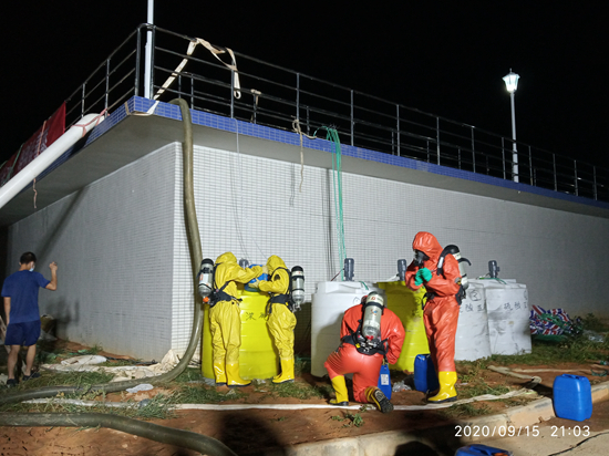 参与现场处置的邓刚透露,由于含苯酚污水的处置方案采用的是高级氧化技术芬顿法,因此需要大量的浓硫酸,及精确控制加药量和加药时间。现场安排的是消防官兵协助往加药桶内添加浓硫酸。面对这种高腐蚀化学品的操作,即便是消防官兵也缺少经验。邓刚见状,一句“我是专业的,我上吧”,便换上防化服背上氧气罩,带领同样全副武装的消防战士前往加药。